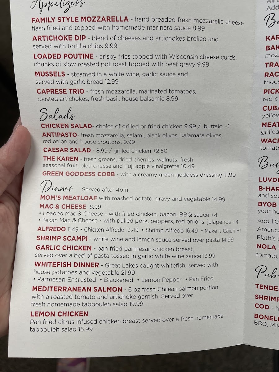 “ My wife and I stopped in for a late lunch around 3pm. The menu states the dinner items on the menu are available after 4pm, so keep that in mind. There are a smaller number of items on the menu than some places, but still a good variety. We were greeted immediately upon walking in and the staff was very friendly and helpful. Service was prompt and out food came out quickly. The quality was great, but the portions were on the smaller size in my opinion. Overall it was a great experience and we will have to return for dinner some time. It cost us 32 for both of us for lunch, including our soft drinks. ”